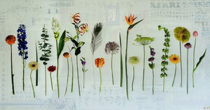 Moderne mixed media kunstwerken, met bloemen als onderwerp, op dubbeldik linnen doek. Oude meesters in een modern jasje.